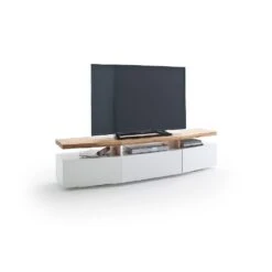 Meuble TV SIGMUND 180 Cm Laque Blanc Mat Plateau ChĂȘne Massif