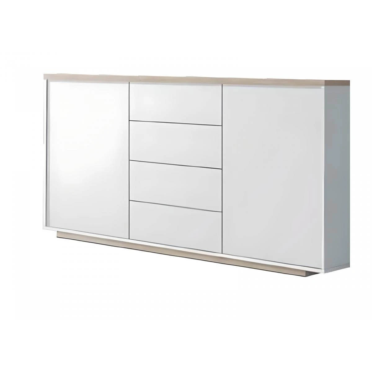 Buffet 2 portes + 4 tiroirs coloris Blanc / ChĂȘne Cambrian en panneaux de particules mĂ©laminĂ©s. Ses tiroirs disposent des glissiĂšres mĂ©talliques. Produit de fabrication espagnole. Meuble livrĂ© en kit.