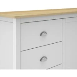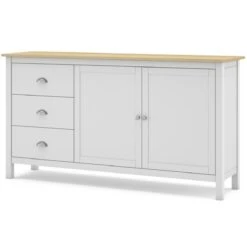 Buffet avec une structure en pin massif blanc et plateau couleur chĂȘne. S’accorde avec de nombreux styles. Offre un espace de rangement spacieux grĂące Ă 3 tiroirs et 2 portes. Design contemporain qui apportera une touche de modernitĂ© dans votre espace !