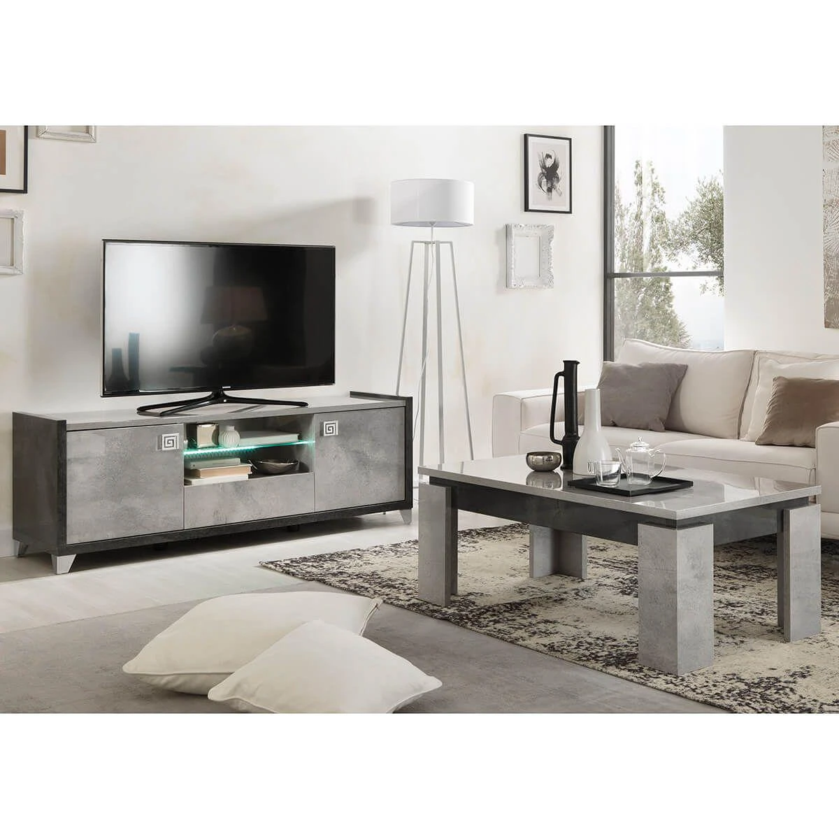 Meuble TV : Structure en panneaux de particules finition mélaminée. Décor effet marbré coloris gris anthracite et vernis polyester finition brillante.