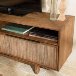 Ce Meuble TV 2 tiroirs 2 niches en bois de teck recyclé a été pensé pour embellir votre salle de séjour. Il capte les regards avec son design ethnique original qui se reflète par sa structure en bois et la façade de ses tiroirs en coco. Avec sa teinte chaude et neutre, il accentue le côté convivial de votre intérieur.