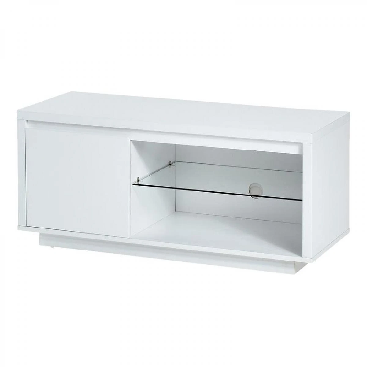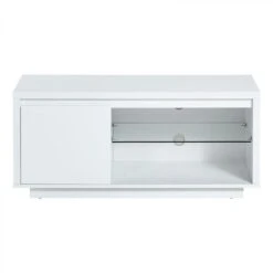 Ce meuble TV avec porte brille d’un éclat contemporain dans votre salon. La lueur bleue de ses LED se reflète tantôt dans son revêtement blanc laqué, tantôt dans sa tablette en verre trempé. Ce meuble TV 100 x 45 x 39 cm a le chic pour mettre votre décor en valeur !