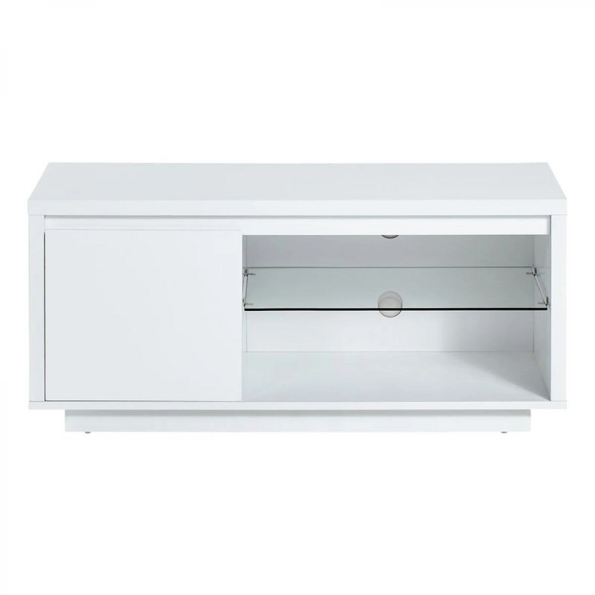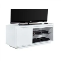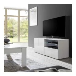 Dans ce meuble TV blanc laqué, tout est optimisé. La surface accueille un écran de 40 pouces. L’espace de rangement derrière la porte de ce meuble TV bas est réservé aux DVD ou aux livres. Quant à la tablette de ce meuble TV contemporain, elle est adaptée au placement des accessoires audiovisuels.