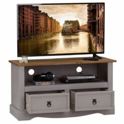 – Le meuble TV est fabriquĂ© en pin massif et lasurĂ© de coloris gris.