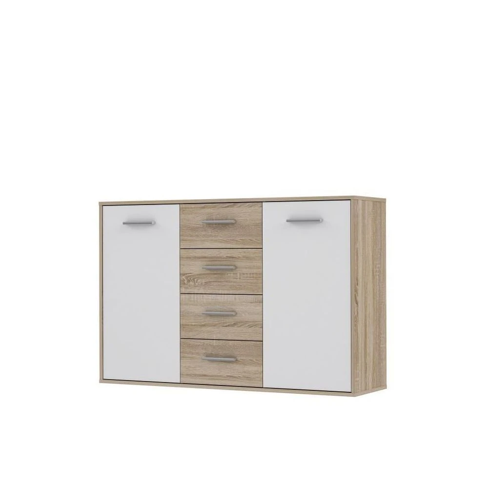 Points forts marque generique PILVI Buffet bas 2 portes 4 tiroirs – Blanc et chene sonoma – L 122,6 x P 34,2 H 88,1 cm