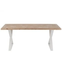 La table à manger MOUNIE comporte 1 plateau en bois clair et un piètement croisé, en métal noir.