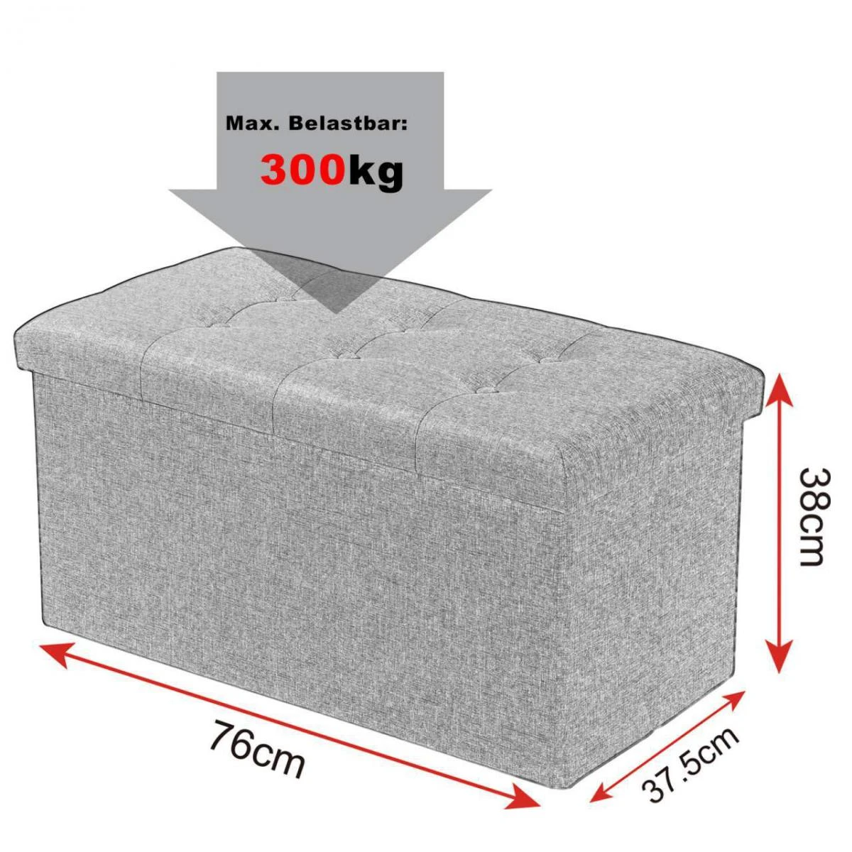 Espace de rangement pratique pour les petites choses comme le livret, les jouets, la tĂ©lĂ©commande, etc. Le siège bien rembourrĂ© en lin vous offre une assise très confortable. Le cadre robuste en panneaux de fibres MDF (classe E1) est très stable et peut supporter jusqu’Ă 150 kg. Tabouret pliable, facile Ă plier et Ă©conomiser de l’espace. Montage et dĂ©montage facile et rapide. Fabrication stable et de haute qualitĂ©. SpĂ©cifications techniques: Matière de l’assise : lin MatĂ©riau Ă l’intĂ©rieur : MDF (classe E1) Dimensions : env. 76 x 37,5 x 38 cm (L x l x H) CapacitĂ© : 80 litres Poids : 5,6 kg (net) Charge maximale : 150kg Couleur : gris, beige, blanc crème, gris foncĂ©, gris clair Contenu de la livraison : 1 x tabouret