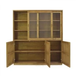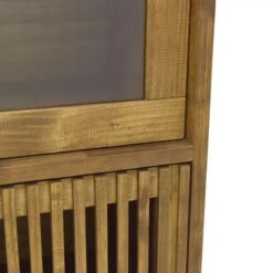 Portes :En bas 3 portes ouvrantes ajourées, et en haut 2 portes coulissantes en verre trempé (4 mm). . Finition :cirée et teintée façon teck. . Garantie :2 ans, pièces. . Poignées :Bouton en bois. . Structure :en bois massif FSC (pin). . A monter soi-même. . Dimensions en cm :L.166-H. 182- P.42. . Dispo pcs détachées donnée fournisseur :NC. .