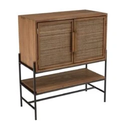Le buffet Willow présente un aspect légèrement industriel avec sa structure en bois et ses pieds caractéristiques, qui commencent à la base et qui se terminent légèrement au-dessus de la table supérieure. Ce mélange de couleurs sombres avec le bois crée un ensemble cohérent et réchauffant.
